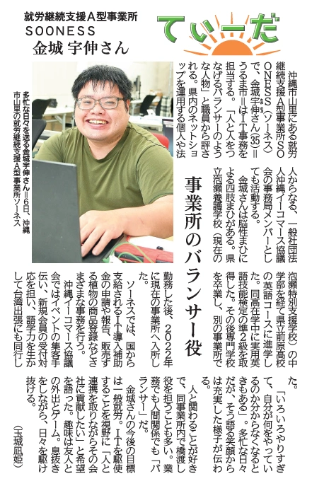 SOONESSのメンバー「金城さん」が琉球新報に掲載されました!